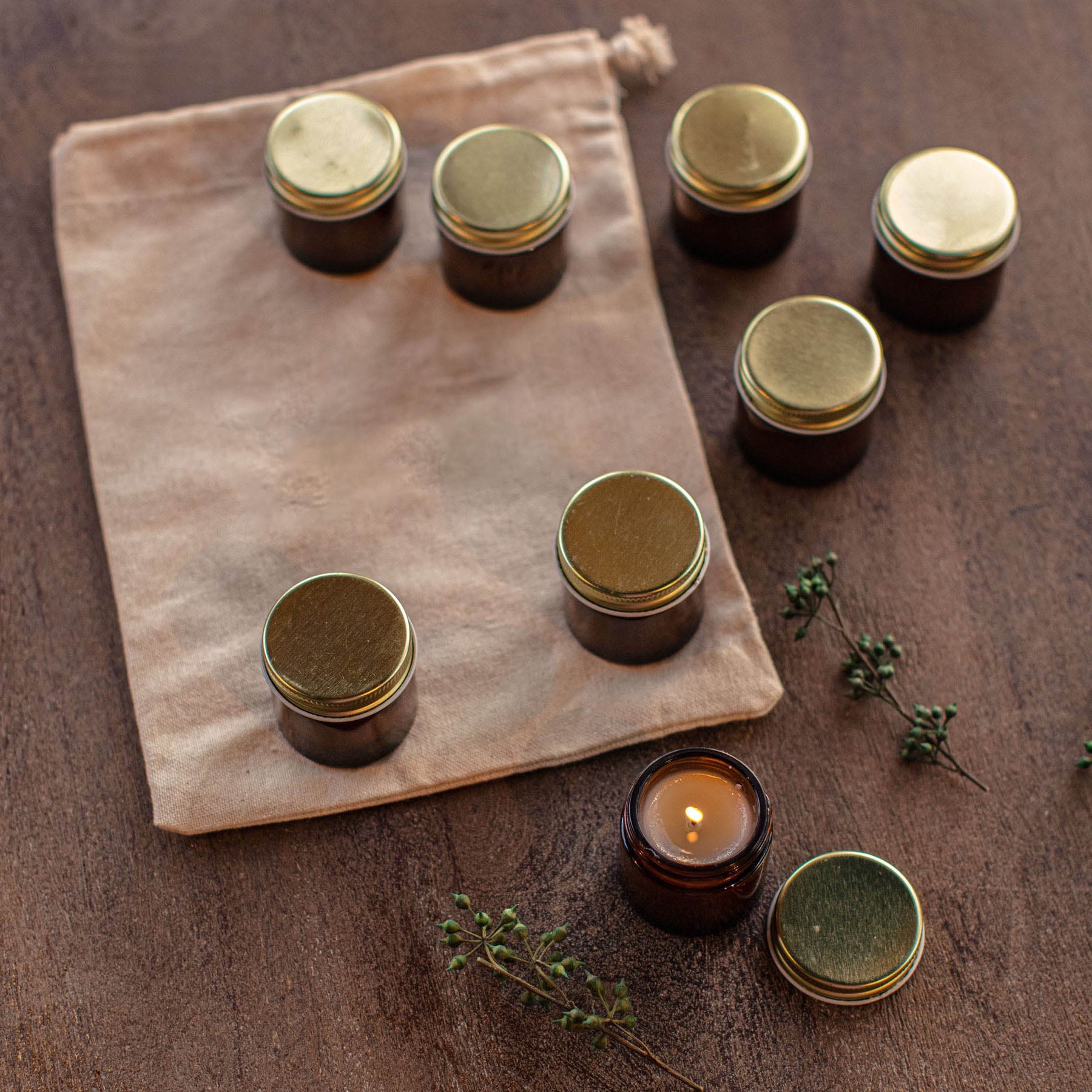 Our set of 8 sample jars are beautifully packaged in a muslin bag. The fragrances include: Apricot Rose, Blushing Rosewood, Forest, Honey Tobacco, Lemon Blossom, Roman Lavender, Spicy Apple, and Vanilla Rain.