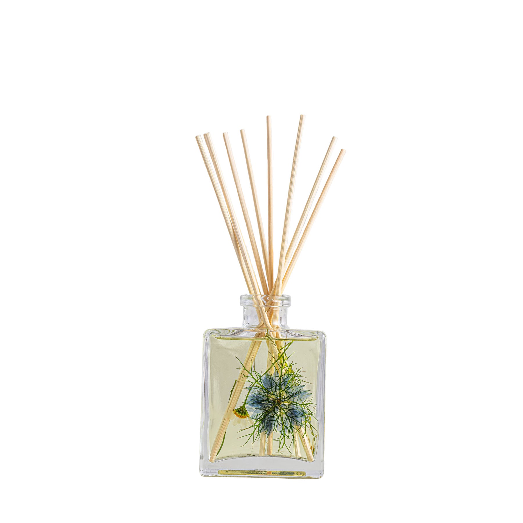 Gorgeous packaging is the perfect complement to dramatic square bottles filled with real spices, fruit and botanicals. Every natural element you see inside the glass vessel is delicately placed there by hand. Lovingly packaged with 10 reed sticks to fragrance your space without a flame.