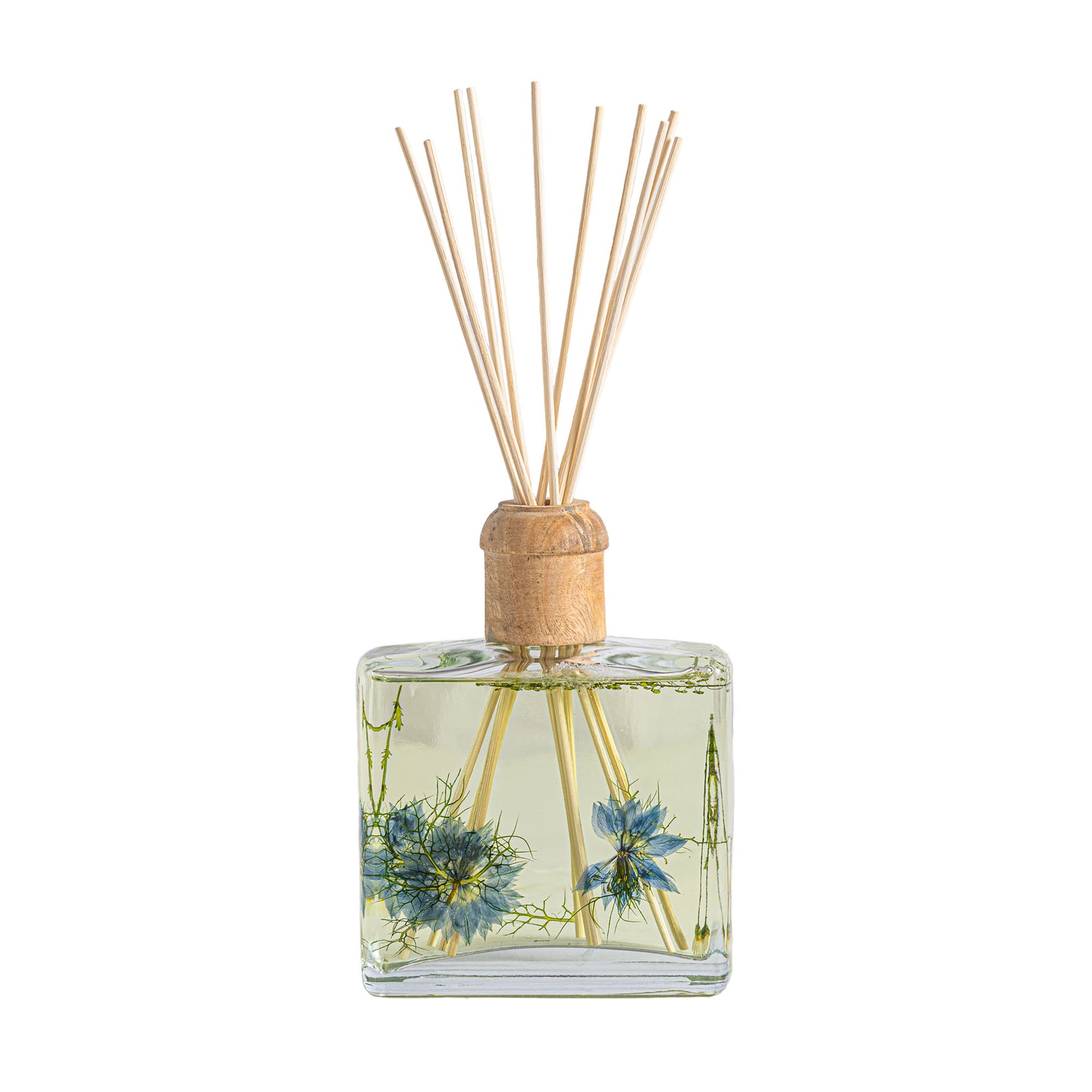 Gorgeous packaging is the perfect complement to dramatic square bottles filled with real spices, fruit and botanicals. Every natural element you see inside the glass vessel is delicately placed there by hand. Lovingly packaged with a wooden cap + 10 reed sticks to fragrance your space without a flame.